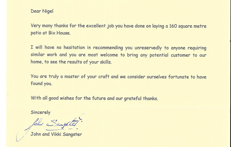"We are writing to thank you for the excellent job you did on our patio. We were impressed with the quality of the work, and the minimal fuss with which you carried out the job. The design, finish and materials are all first class and the end result is a stunning addition to the house and garden. And all this at a price much lower than we had anticipated. We will certainly use you again in the future and have no hesitation in recommending you to anyone. Thanks once again."